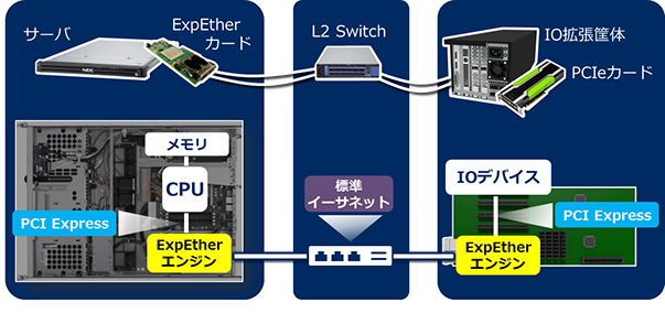 既存のハードウェア、ソフトウェア (OS, ドライバ)を一切変更することなく、PCI Expressバスを一般的なイーサネット上に拡張できるNECの独自技術です。